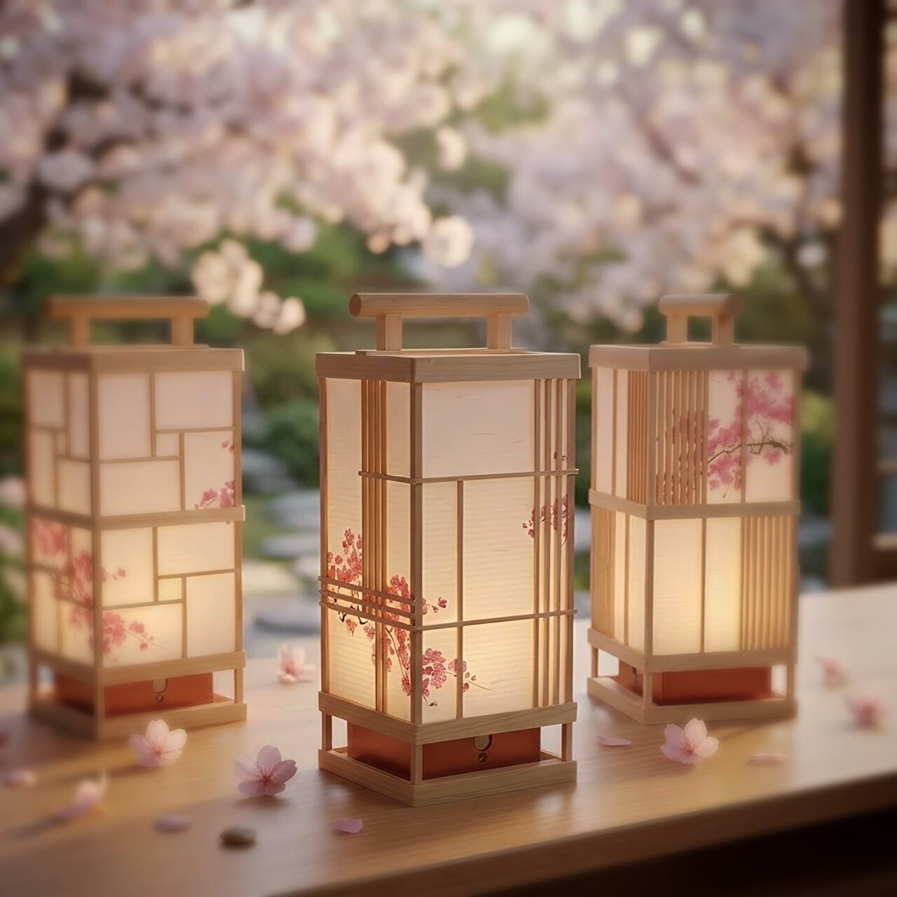 ソメイヨシノの花言葉は、清純、高貴、優美な女性。真っ白な障子紙を広めに純潔さを表現し、そこへ優美な桜を描きました。これを和紙に印刷して貼って格子を組みましたオリジナルデザインです。
